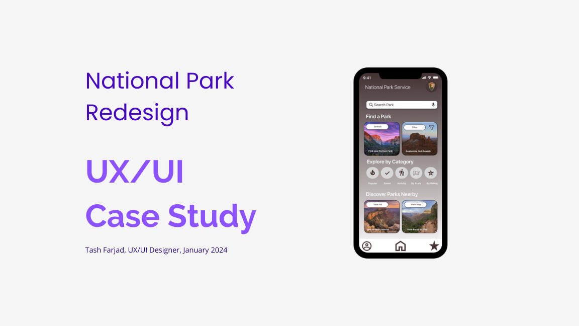 In this project, I redesigned the National Park Service mobile and web interface. Key improvements include a more noticeable search bar, use of UI cards for easier and more intuitive navigation, and integration of voice-recognition search.